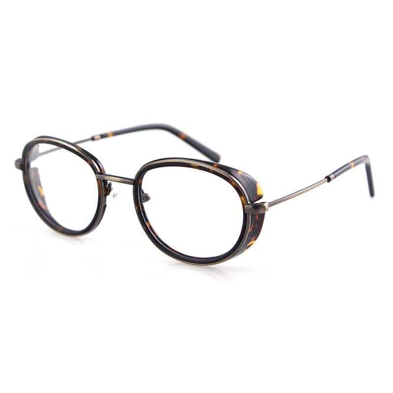 This glasses frame is made of metal. The eyebrow have acetate decoration unique design. And the temples have stripe metal with acetate end tips.